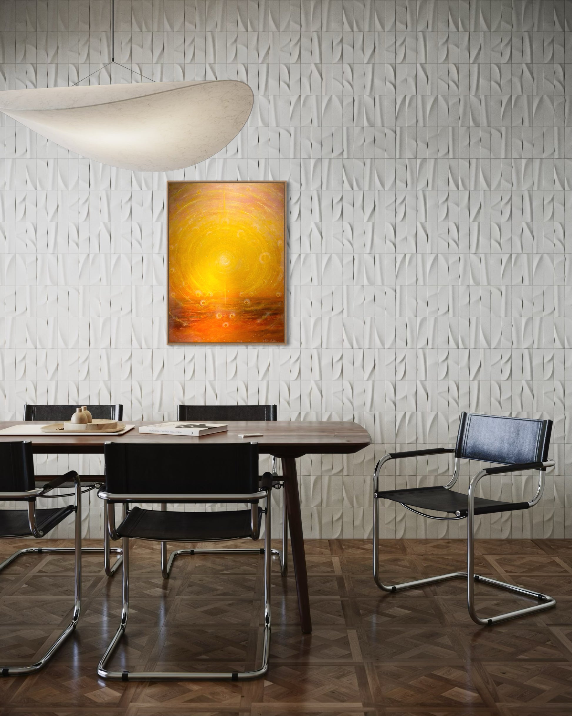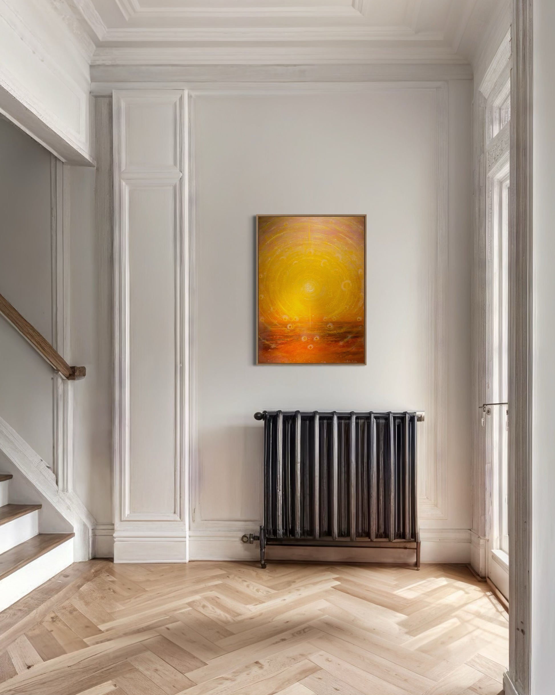 “Cycles of Light” embodies the eternal presence and cyclical nature of light. The radiant point in the center represents the source of light, showing how it remains ever-present, even when we cannot actively see or feel it. Around this source, energy circulates, reflecting the cycles of life and nature, with a reminder that in presence, there is daily hope and renewal.