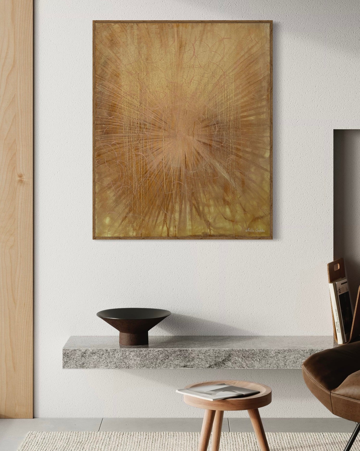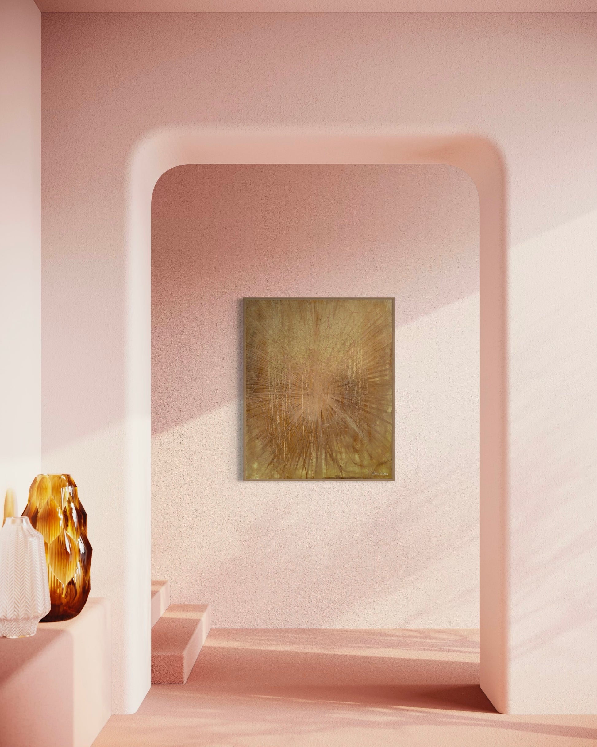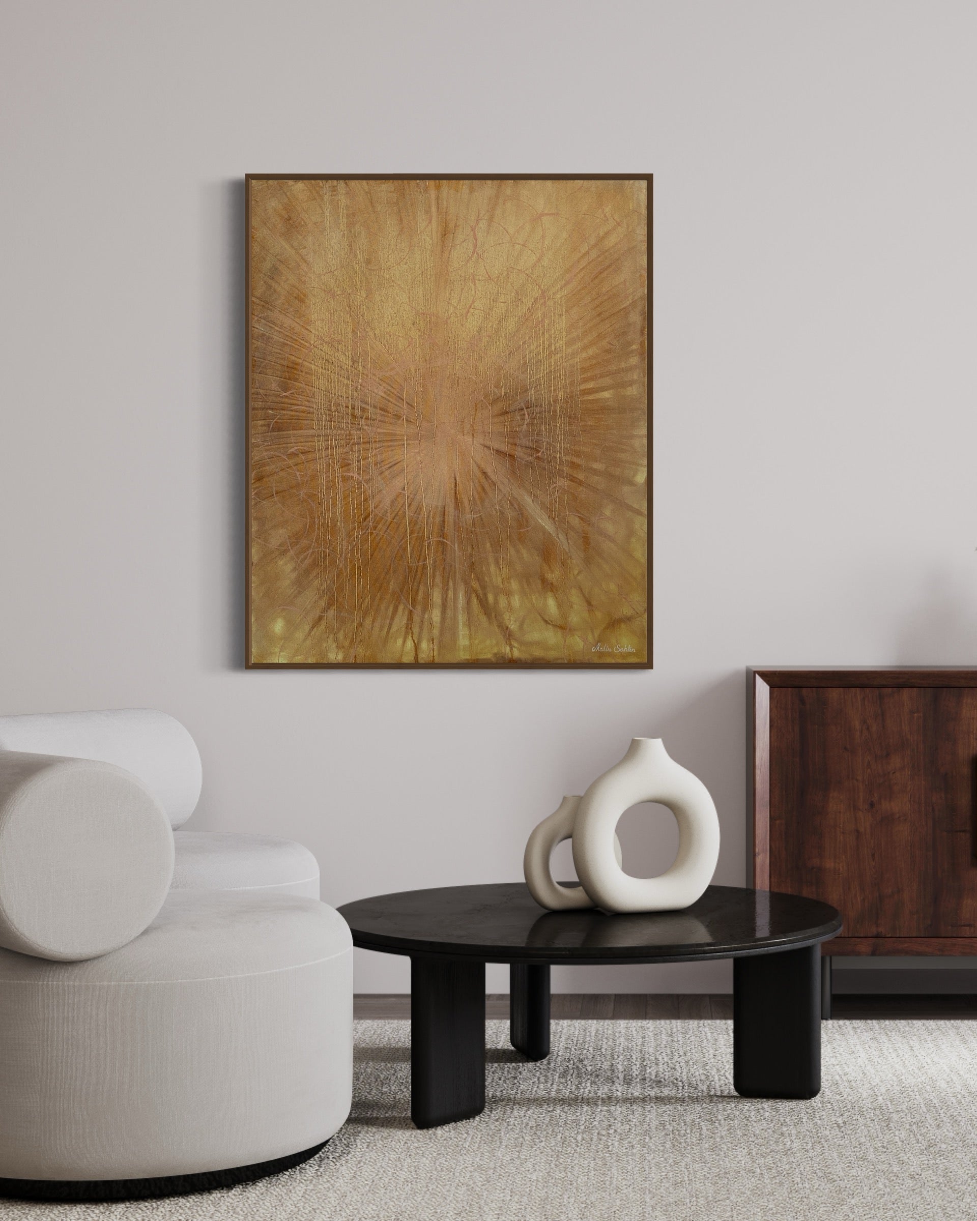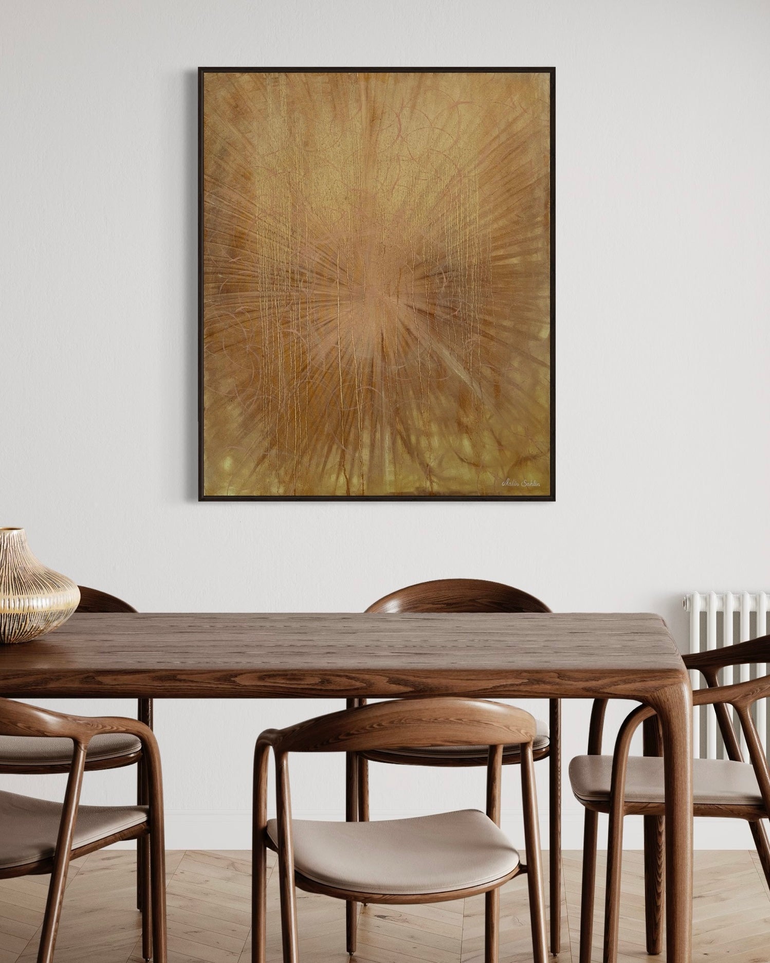 'Eternal Now' is an artwork that captures the essence of the present moment in all its radiance and depth. The center of the canvas is illuminated by a brilliant light, surrounded by lines that extend both vertically and horizontally, creating a sense of expansion and continuity. These rays represent the infinite possibilities of the present moment, stretching outwards in every direction. The subtle circles throughout the canvas represent the cycles of life, each with its own beginning and end, but forever connected in a continuous stream.