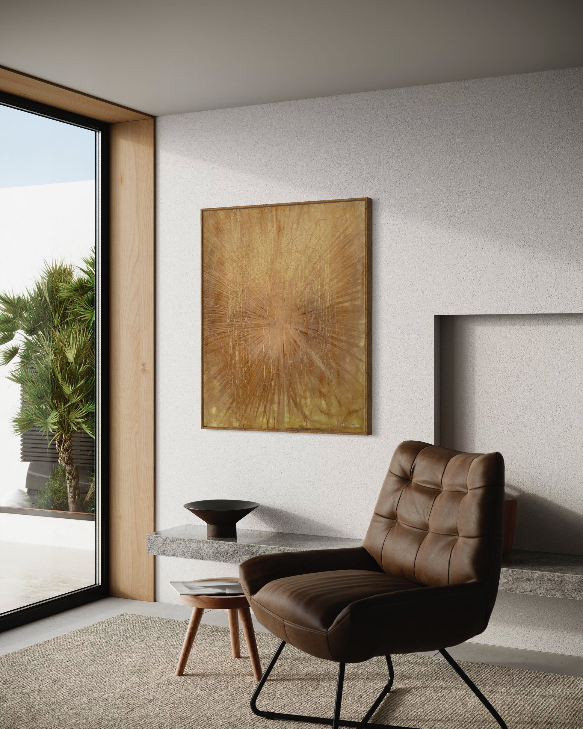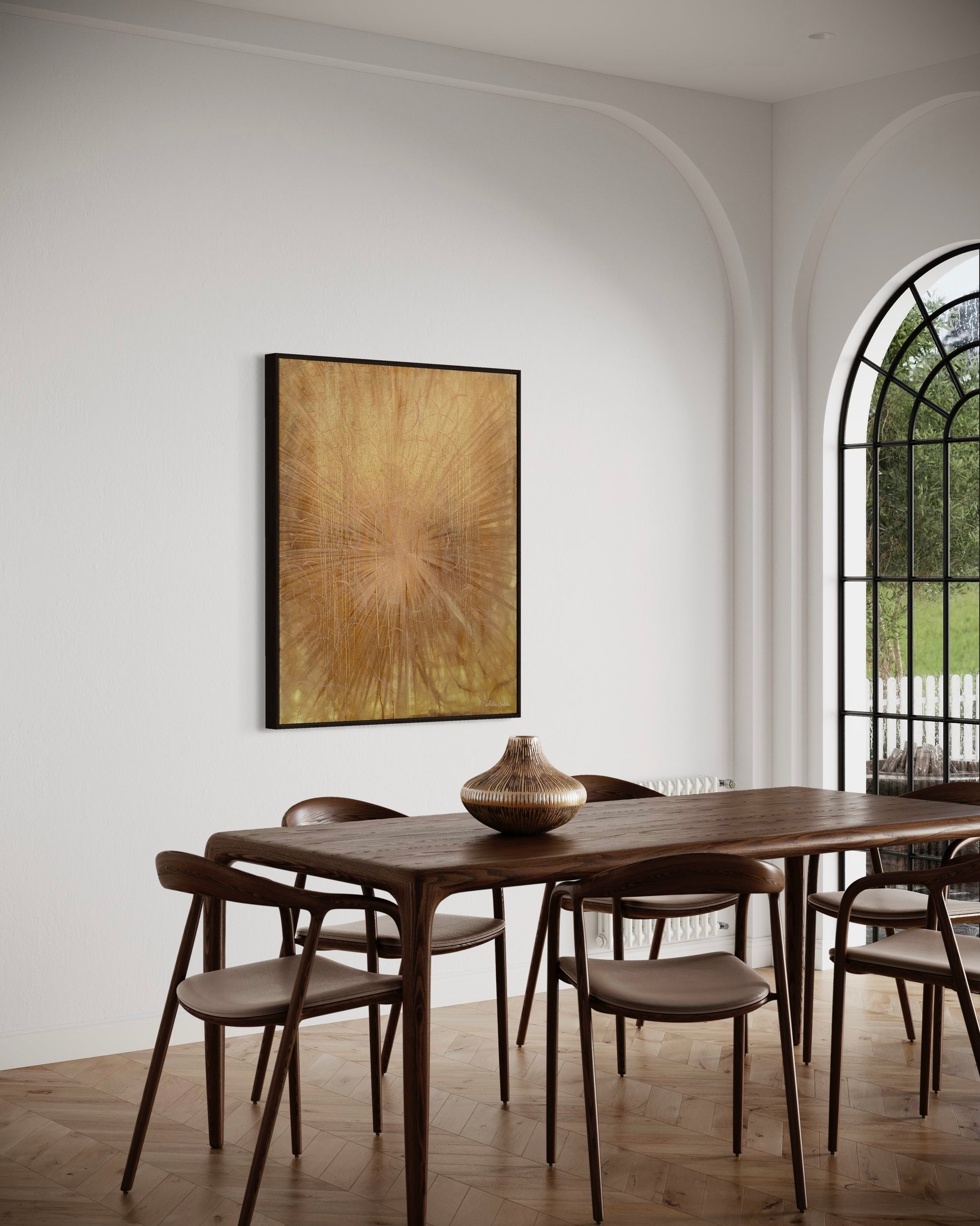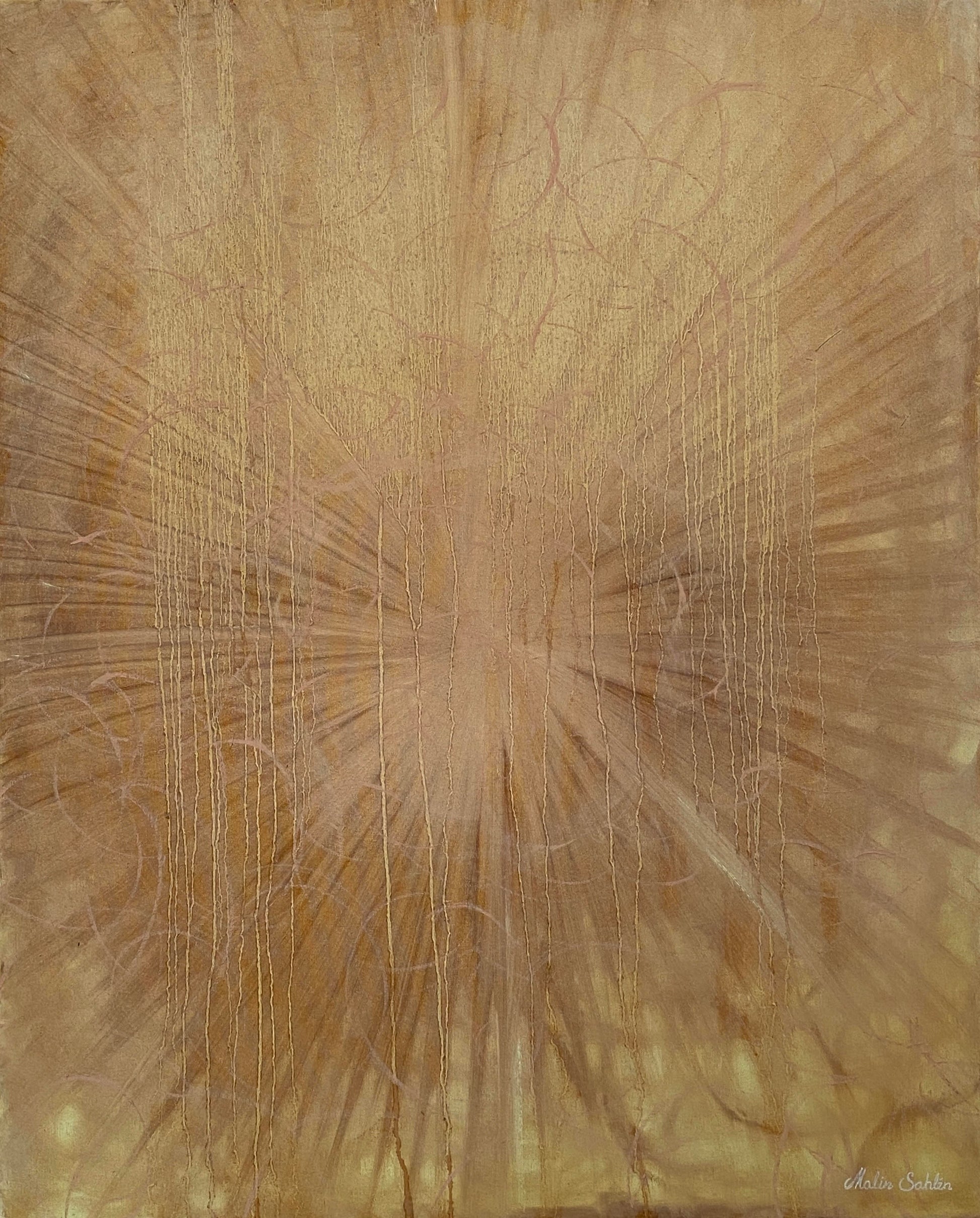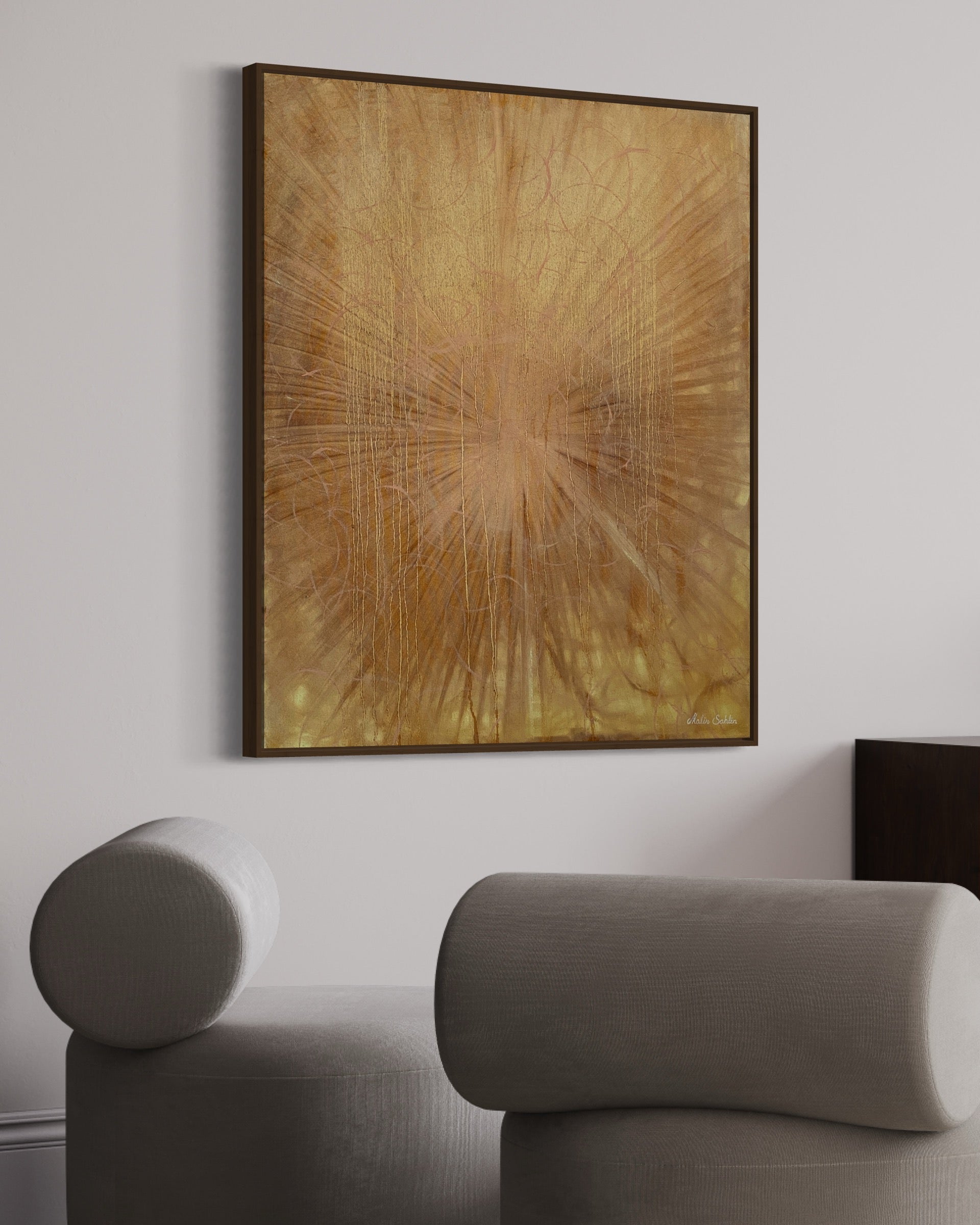 'Eternal Now' is an artwork that captures the essence of the present moment in all its radiance and depth. The center of the canvas is illuminated by a brilliant light, surrounded by lines that extend both vertically and horizontally, creating a sense of expansion and continuity. These rays represent the infinite possibilities of the present moment, stretching outwards in every direction. The subtle circles throughout the canvas represent the cycles of life, each with its own beginning and end, but forever connected in a continuous stream.