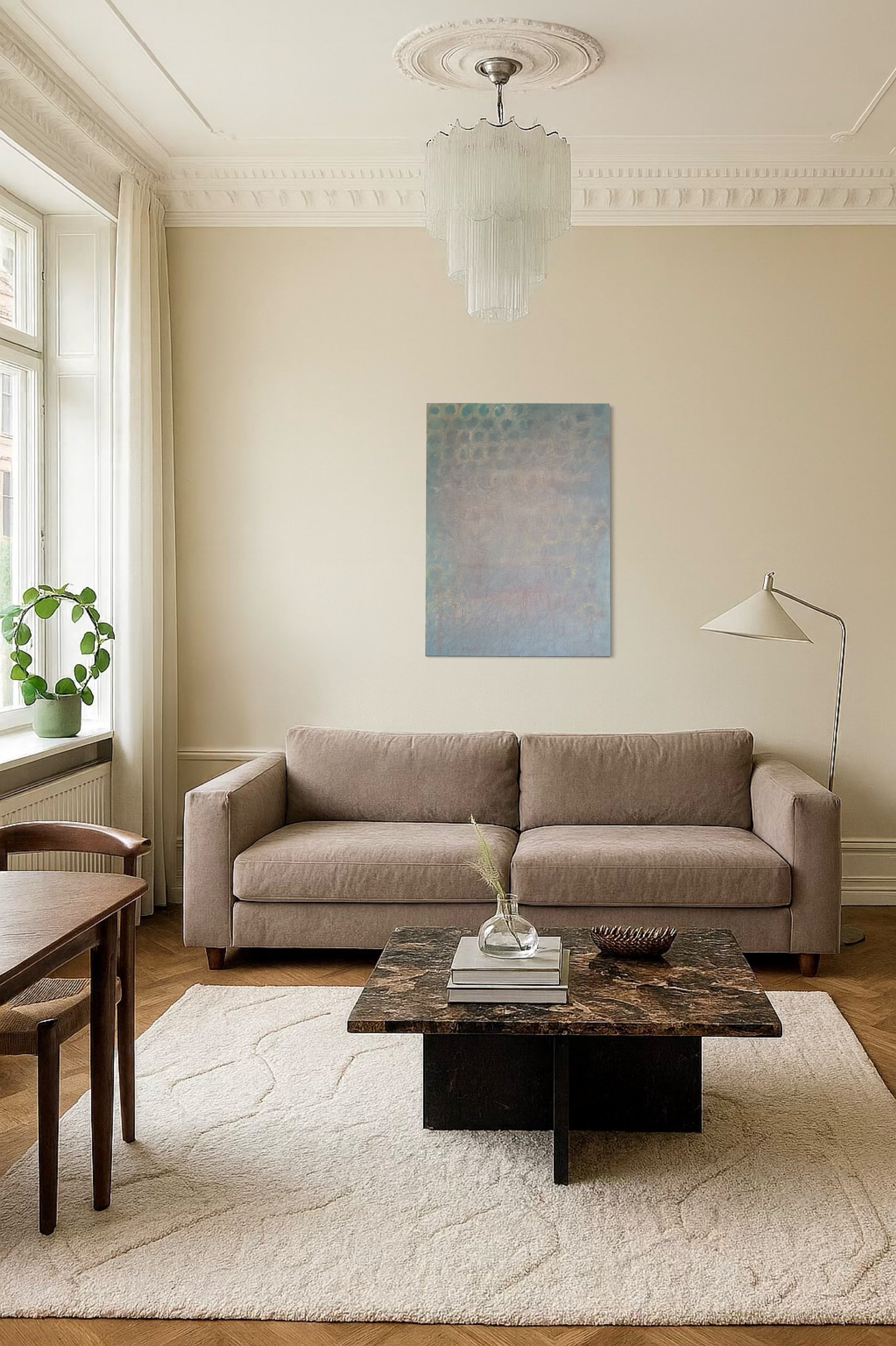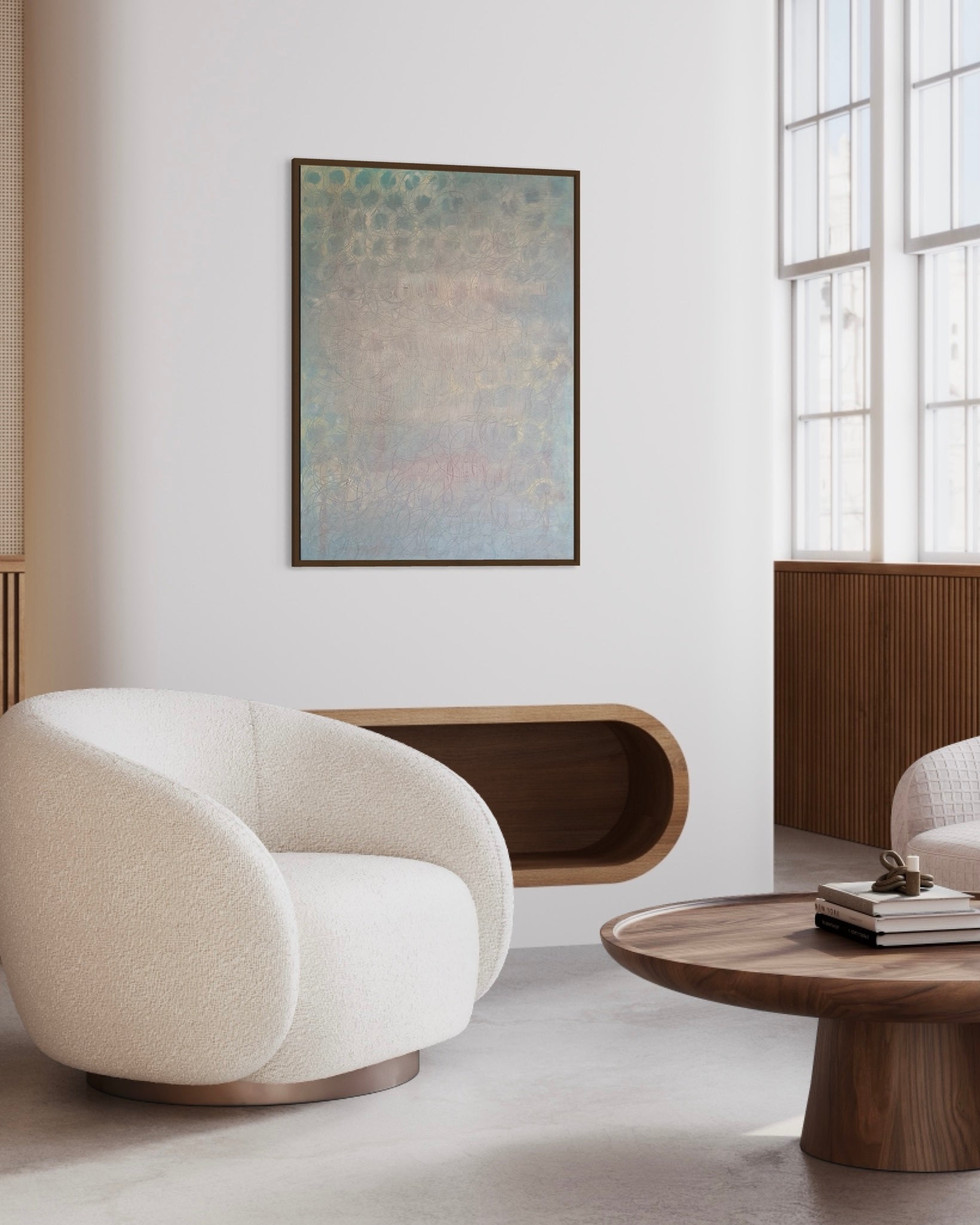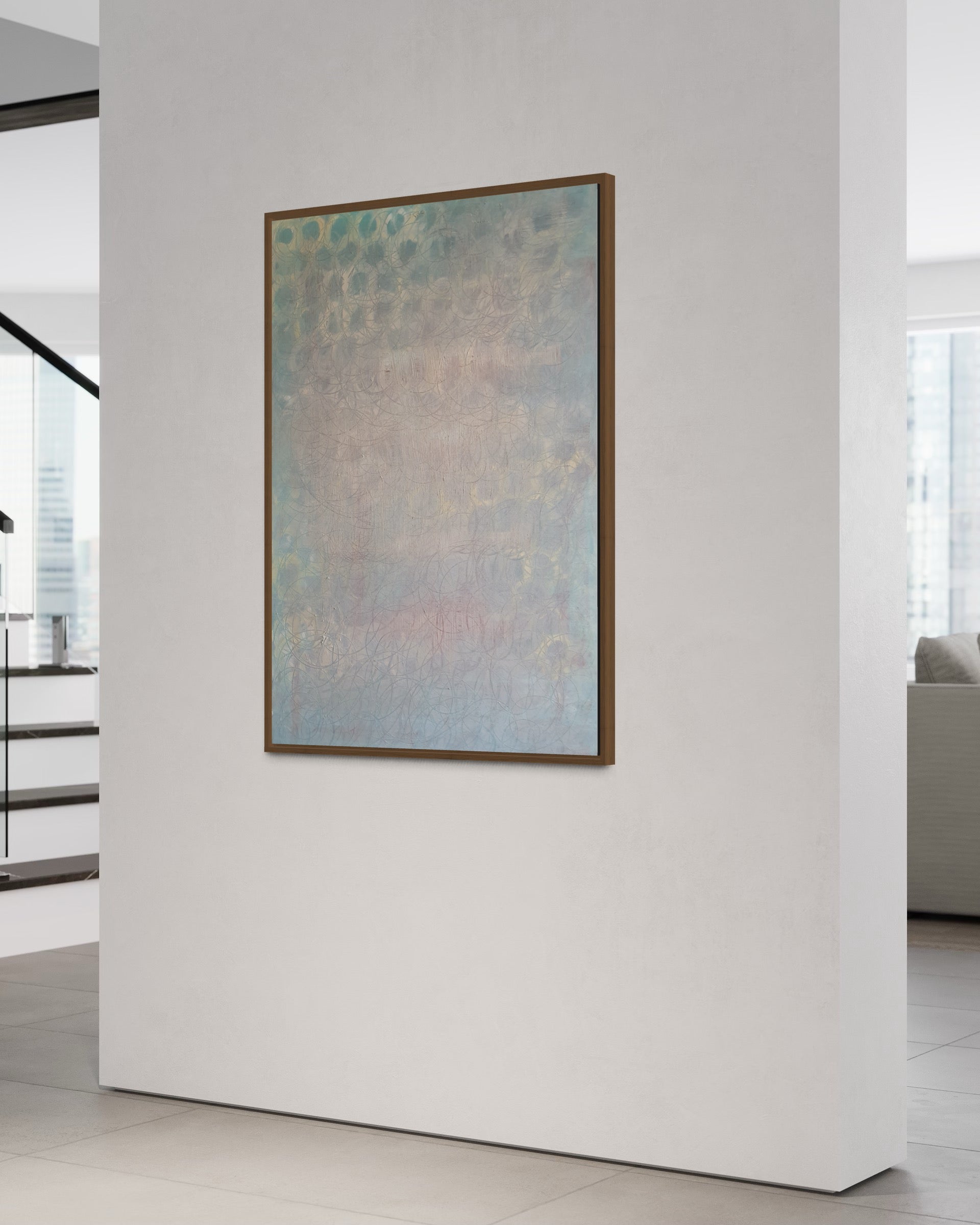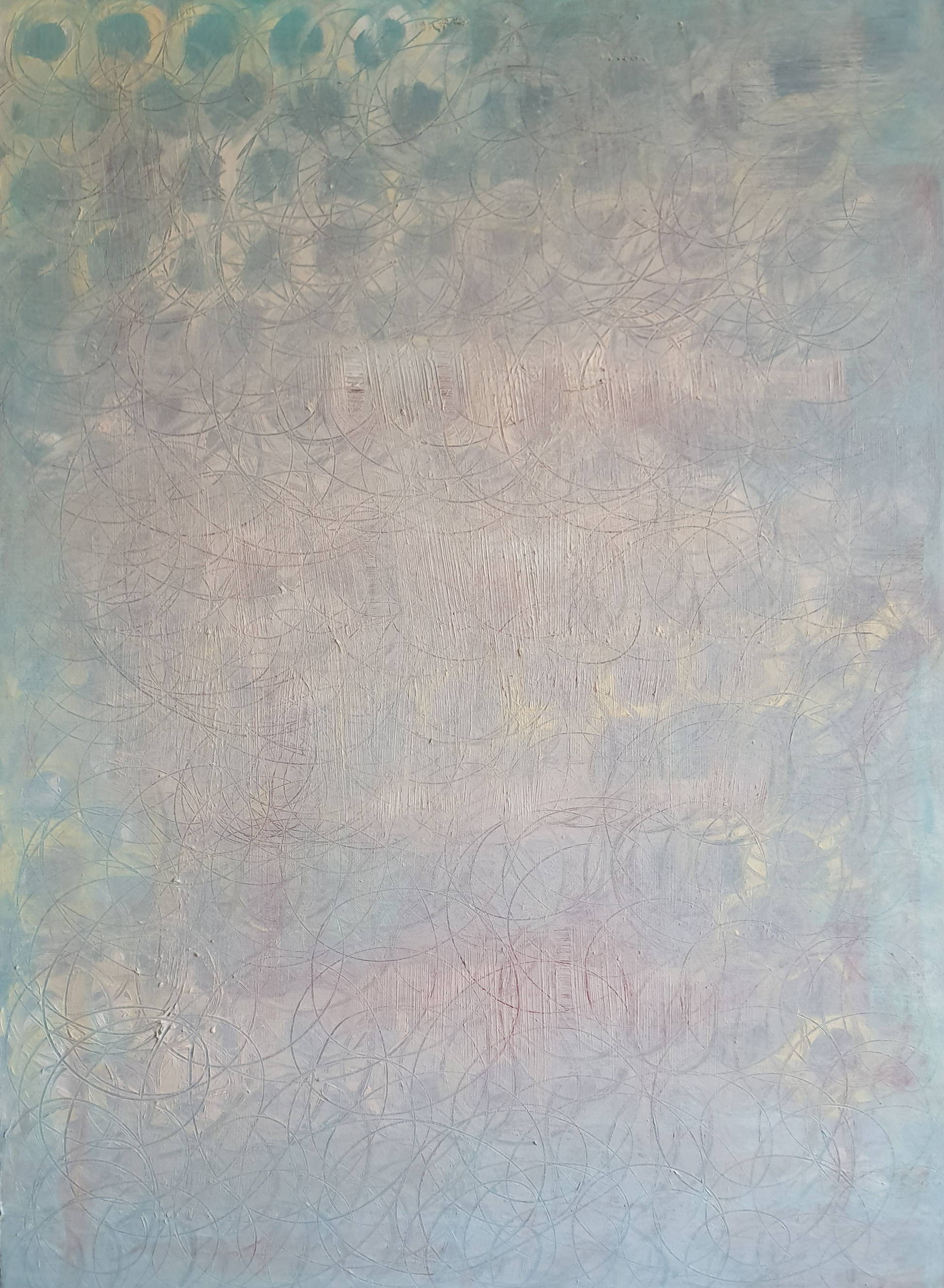 'In the light' is an artwork where the harmony of geometry meets the purity of light. Each circular form represents the cycles of life, while the visible rays of light invite the viewer to embrace the presence of light in our lives. The painting urges us to see the beauty in every moment, to choose to live in the light through life's changes, and to find harmony in life's continuous flow.